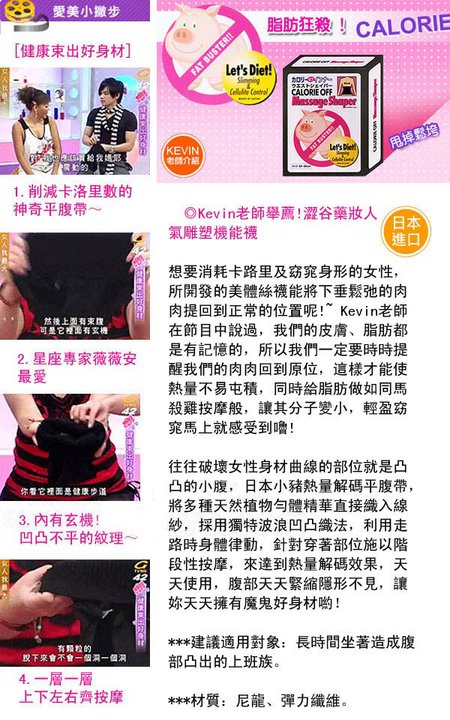 日本美妆杂志强烈推荐!只要走路就能热量解码,天天穿~凸凸小腹悄悄不见啦! 往往破坏女性身材曲线的部位就是凸凸的小腹,日本小猪热量解码平腹带,将多种天然植物匀体精华直接织入线纱,采用独特波浪凹凸织法,利用走路时身体律动,针对穿著部位施以阶段性按摩,来达到热量解码效果,天天使 用,腹部天天紧缩隐形不见,让你天天拥有魔鬼好身材哟!
