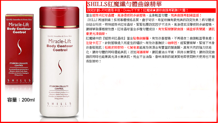 SHILLS將勻體成份結合科技-特殊超微米紅球晶球,緊緊包覆窈窕因子不流失,高滲透至深層吸附多餘囤積,讓精華發揮極緻效應。紅球晶球富含多種勻體成份,有效緊緻腰腹曲線、纖盈修長雙腿、撫平橘紋讓肌膚更光滑細緻。