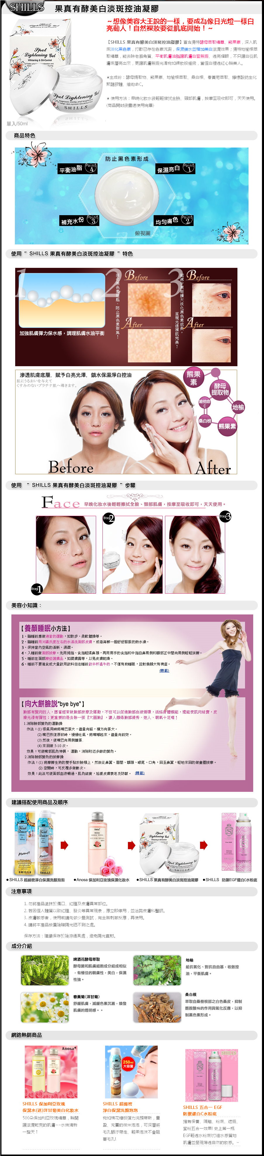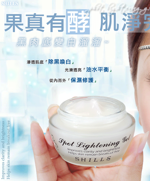 Description : Shills Spot Lightening Gel 50ml 美容大王說:希望像日光燈一樣白亮動人!SHILLS榮重推出「SHILLS果真有酵美白淡斑控油凝膠」,深入 肌底淡化黑色素,更添加天然控油成分、淨化毛孔,不會增 加肌膚負擔,不只讓白從肌膚底層亮出來,更讓肌膚無瑕光 滑宛如裸妝般細緻,當個蘋果臉的心機美人。 商品說明:富含獨特酵母萃取精華、熊果素能強韌肌膚防護 機能,能打散已存在的色素沉澱、減少斑點色素形成,補充 表皮水分增加美白效果;獨特地榆根萃取精華,能深入毛孔 淨化肌膚、去除老廢角質、收斂控油讓肌膚白皙無瑕、透亮 耀眼,當個白光心機美人。