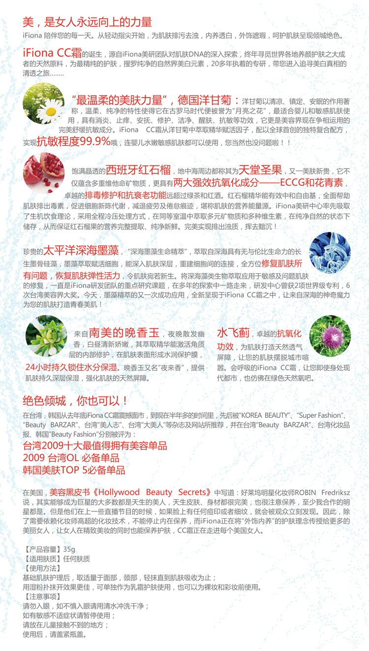 使用方法:肌肤护理后,取适量于面部和颈部,轻拍直到肌肤吸收为止,裸装或在进行彩妆均可。