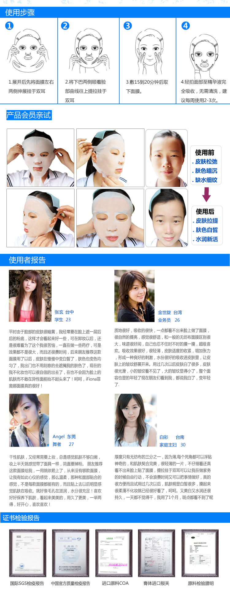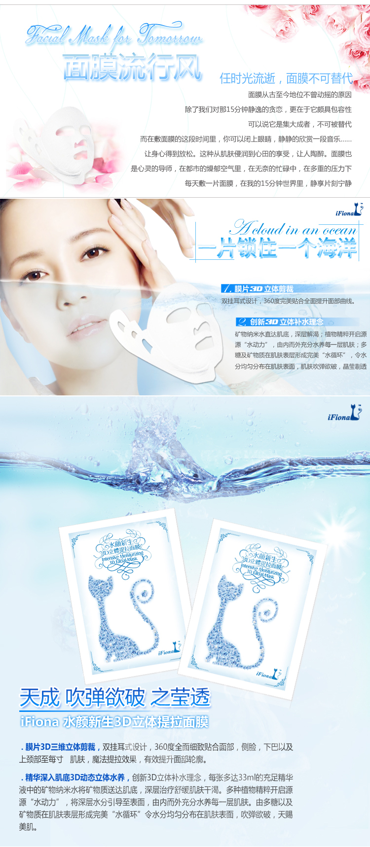 三维立体剪裁,双挂耳式设计,360度全面细致贴合至每村肌肤,魔法提拉效果,有提升面部伦敦,饱含多达33ML 精华液,由雪山矿物水, 添加多种天然植物萃取而成, 有提升肌肤新陈代谢,增加角质层水合能力,深度补水并牢牢锁住水分,肌肤清新明亮。。