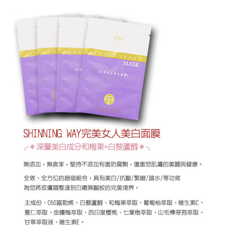 和梅果(09年日本最紅的美白成分) 首度添加了和梅果萃取精華在產品中,並運用它來避免角質細胞吸收黑色素,達到讓肌膚不變黑的目的,最快的美白方式就是所使用的美白產品要能由內在開始抑制、阻斷黑色素形成的路徑,並從表面代謝、淡化黑色素及斑點,就能達到最佳美白效果。同時也是09年日本最火紅、大小品牌都在瘋的新美白成分。 白黎蘆醇 白黎蘆醇的功能可增強C的利用,使皮膚代謝良好,預防黑色素囤積,是天然防曬物質,美白、護膚、更白皙潤澤,保護肌膚免紫外線荼毒,並預防膠原蛋白、彈力蛋白退化,使肌膚更緊實、更年輕。 西印度櫻桃、維他命C 淨化肌膚掃除黯沉,能深入肌膚底層,幫助還原黑色素,美白淡化肌膚。 水解蠶絲蛋白 在醫療上膠原蛋白雖然已廣泛被使用。但此類膠原質因分子量較大,較不易為皮膚所穿透,必須借由長時間敷臉或導入幫助加強吸收。蠶絲親水性極佳,為天然的調節因子,特佳的保濕性;能鎖住肌膚水份防止乾燥、脫妝,並能預防黑色素形成。 金縷梅萃取液 為榛樹之天然萃取液,具舒緩、收斂、鎮定肌膚作用,能有效調節皮脂分泌、平衡油脂分泌量。 薏仁 含有相當多的蛋白質與油脂、維生素 B1、B2,以及鈣、鐵、磷等礦物質。其中蛋白質能分解酵素,軟化皮膚角質,使皮膚光滑。另外,薏仁可促進體內血液和水分的新陳代謝。 ★主成份 C60富勒烯、白藜蘆醇、和梅果萃取、葡萄柚萃取、維生素C、薏仁萃取、金縷梅萃取、西印度櫻桃、七葉樹萃取、山毛櫸芽孢萃取、甘草萃取液、維生素E。 ★面膜創新材質 新面膜布材質,由蠶繭所抽出的蠶絲纖維與純棉交織而形成的多層次蠶絲布,具無菌、多孔性、親膚性、吸濕性與透氣性等多種優秀的特質,能與精華液緊緊貼合,極速將有效成份傳遞進入肌膚深層使之吸收 ; 美國聯邦政府更是極力推薦民眾使用這種親膚性極佳的蠶絲布作為嬰幼兒衣物的主要材質。 ![]() ![]() ![]() ![]()