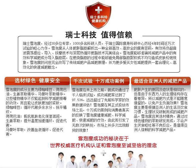 Description : 使用说明:(使用周期)早晚各一次,用于清洁皮肤之后,睡前做最佳。 使用方法: 充分摇匀:在充分摇匀到听不到水声后,瓶身直立挤压出适量的雪泡。 用力按压:取适量(按压直径约3cm的泡沫与手心),以画圈的方式由内而外按摩部位2~3分钟。 均匀涂抹:将按摩过的部位配合轻微或中度运动。 减肥产品您可千万小心,别图便宜买到假货,不但浪费钱,还伤害身体。