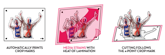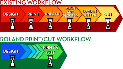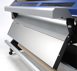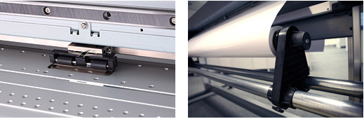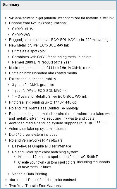 Quadralign ![]() For laminating graphics, simply remove prints, laminate and reload them for precision cutting. The Quadralign four-point optical registration system automatically realigns the cutting path and compensates for skew and distortion. The XC-540MT also functions as stand-alone vinyl cutter. ECO-SOL MAX Ink ECO-SOL MAX is a remarkable innovation in ink technology, offering fast drying time, high density, wide color gamut, rugged scratch resistance, low cost per square foot, and broad uncoated media support. In addition, ECO-SOL MAX is virtually odorless. For the standard XC-540MT configuration, ECO-SOL MAX comes in CMYK+Mt+W ink sets (220ml cartridges). A double white model is also available (CMYK+WW). ECO-SOL MAX graphics are water and UV resistant up to 3 years outdoors* for CMYK graphics, up to 1 year outdoors for White ink and 1-3 years outdoors for Metallic Silver ink. * Outdoor durability is based on accelerated weather tests. Results may vary depending upon location and application. Dry times vary depending on specific media characteristics. Lamination may be required for some applications or environmental conditions. Roland Intelligent Pass Control Technology Roland Intelligent Pass Control technology developed by Roland software engineers represents the pinnacle of inkjet printing. This patent-pending system precisely controls dot placement between passes and delivers unprecedented imaging performance in all resolutions. The technology actually enhances image quality at higher print speeds thereby increasing productivity. As a result, the XC-540MT produces smooth gradations and flawless solid colors while achieving faster throughput with virtually no banding in all print modes.Advanced Media Handling ![]() A true production printer, the XC-540MT features an upgraded media feed and take-up system accommodating rolls of up to 66 lbs. for long, unattended printing. Seven permanent repositionable pinch rollers enhance image quality through even the longest print runs. In addition, the XC-540MT features media guides, a vacuum platen and twin head heights to ensure correct media feed for thin or lighter media. Integrated Tri-Heater System The XC-540MT’s integrated tri-heater system dries prints quickly even in high-speed modes for immediate finishing, installation or collection by the take-up system. The system features three components: a pre-heater that improves media receptiveness, a print heater to accelerate ink fastness and brightness, and a dryer to accelerate the drying process and improve productivity, workability and scratch resistance. All can be controlled from either the printer panel or Roland VersaWorks. DU-540 Dryer System ![]() The DU-540 heater/blower is included with the XC-540MT. Depending on the media, it is necessary to use the included DU-540 dryer/blower unit to ensure proper ink adhesion and to assist with dry times. the DU-540 is also recommended to be ON when printing with the metallic silver and white ink configuration. Roland recommends 15 minutes of drying time in order for the metallic silver or white ink to dry fully. This is important in print modes where CMYK is printed on top of white or metallic silver. Testing prior to beginning production is highly recommended. Reliability As with all Roland inkjet printers, the XC-540MT is a virtually bulletproof production machine. With regular maintenance, it will provide years of trouble-free service. But, unlike most inkjets that require daily maintenance, the XC-540MT requires servicing significantly less often. The XC-540MT ink system features a motor-driven elevator that automatically adjusts to print head height. It has wipers that clean two heads at a time and flush the ink on each pass. High-Speed Network Connection Equipped with Roland’s own 100 BASE-TX/10 BASE-T interface, the XC-540MT connects seamlessly to office networks without additional software, achieving an increased data transmission rate of 100 Mb/sec. This makes it easy to configure a highly efficient printing environment. ![]() ECO-SOL Media ECO-SOL Media is developed especially for Roland ECO-SOL MAX ink and includes a wide selection of competitively priced, uncoated adhesive-backed vinyls and other popular substrates. The line-up currently consists of glossy, matte, clear and translucent calendered, premium cast vinyl, premium reflective vinyl, view-through vinyl, flame retardant scrim banner, blockout scrim banner and solvent glossy paper. All Roland media is carefully tested and profiled to consistently achieve high-quality results. Reliability As with all Roland inkjets, the XC-540MT offers years of reliable service, even in the most demanding shop environments. Each one is built with solid construction and enhancements for precise media control. It also features print head maintenance systems for unmatched mechanical reliability. Low Running Costs